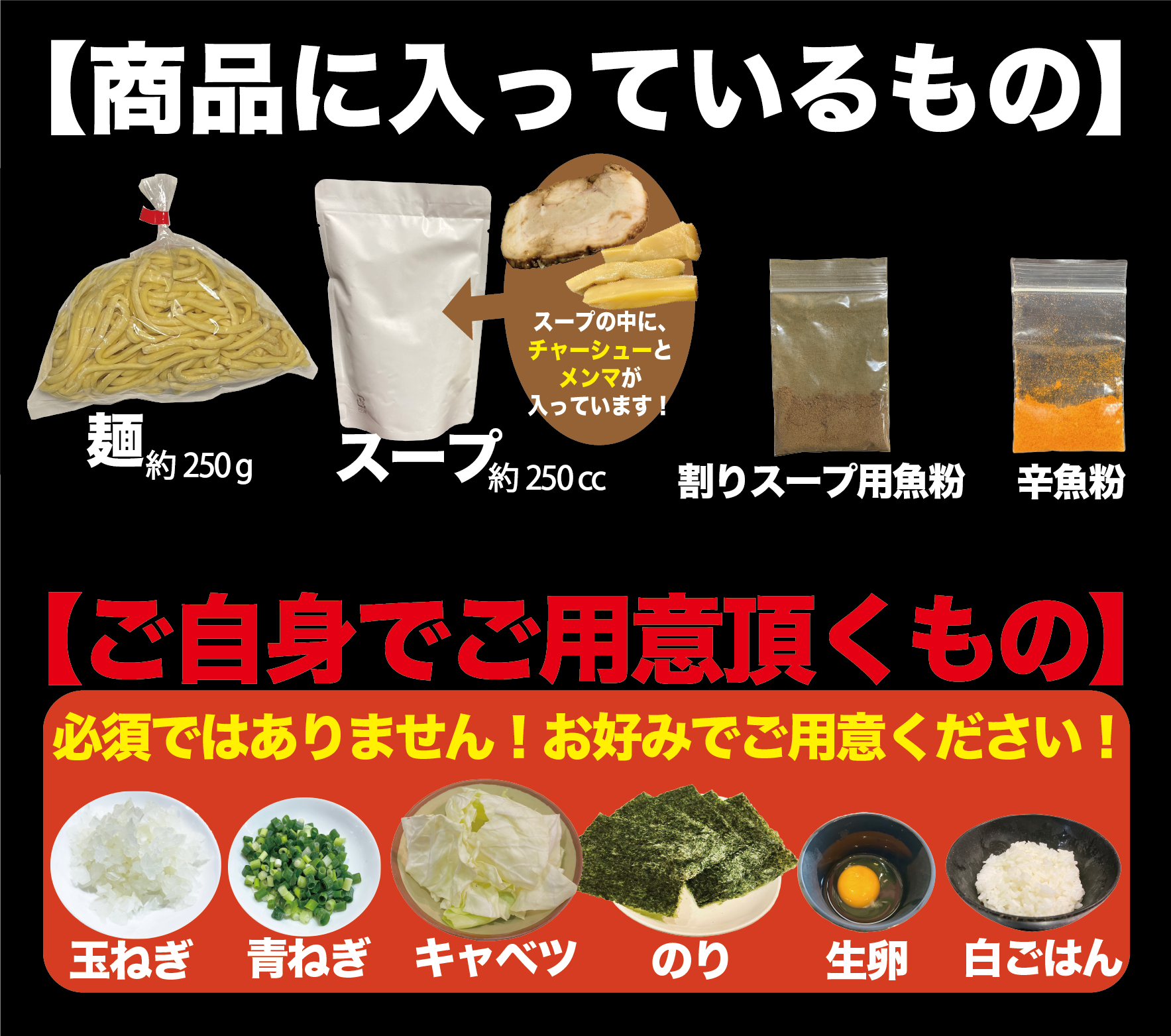 スープの中に「チャーシュー」と「極太メンマ」が入っています。(その他の具材は入っておりませんので、お好みでお入れください。)